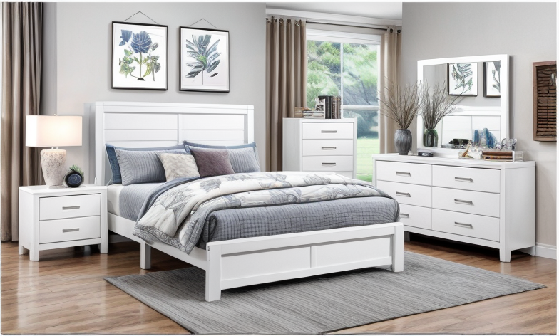 Líneas modernas y estilo rústico se combinan para crear el estilo de la Colección Corbin. La textura de la chapa de papel impresa en 3D se realza con un acabado blanco que le da un aspecto de madera realista. Los frentes de los cajones de la cómoda, la cómoda y la mesita de noche presentan herrajes metálicos negros que contrastan a la perfección. Un sutil marco define el perfil del cabecero y el pie de cama, realzando aún más el diseño desenfadado de la colección.