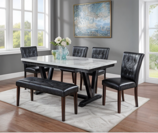 Introducing a harmonious combination of modern sophistication and classic elegance. This dining set features a refined marble-effect table supported by a distinctively designed black trestle base, creating a striking contrast. Accompanied by elegant chairs, accented with stud trim and upholstered in rich faux leather upholstery, this set is a testament to understated luxury. The additional bench option encourages group dining and adds versatility.