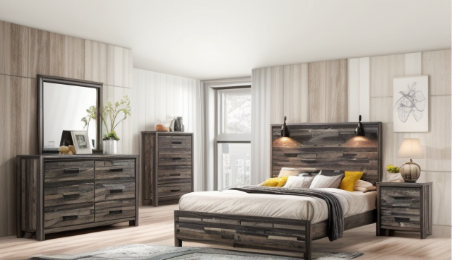 This bedroom set combines rustic appeal with contemporary lines, offering a cozy yet refined aesthetic to any modern home. The set features a generously sized bed with a wide plank headboard with integrated sconces, creating a welcoming atmosphere. Flanking the bed are a matching nightstand and dresser, each offering ample storage space with a series of effortlessly open drawers. The dresser, complete with a full-length mirror, offers additional storage and a dressing area, all contributing to the spacious feel of the room. The distressed wood finish of each piece is complemented by dark metal hardware, adding an industrial touch to the ensemble.